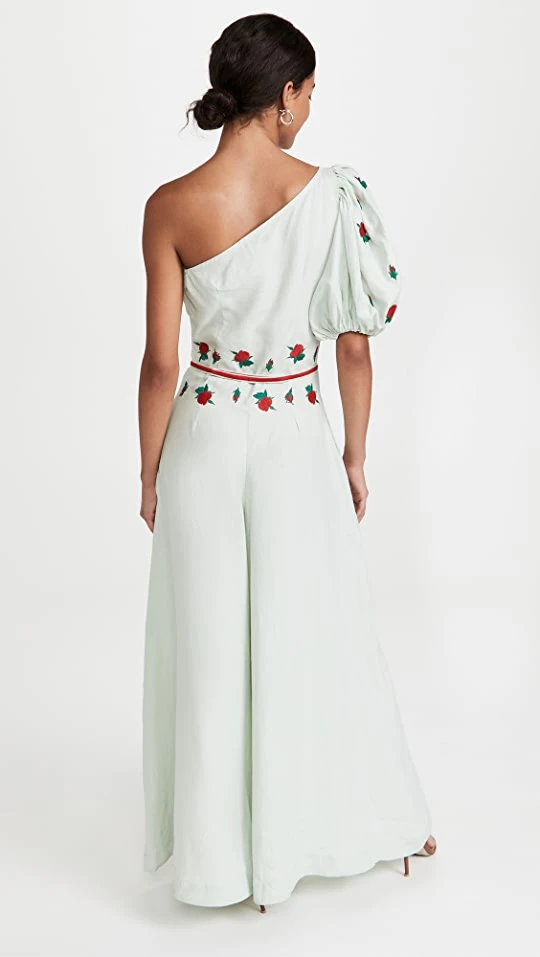 Rose embroidery helps define the waist and sleeve of this striking Fanm Mon jumpsuit, which features an elegant one-shoulder neckline and a wide-leg cut.